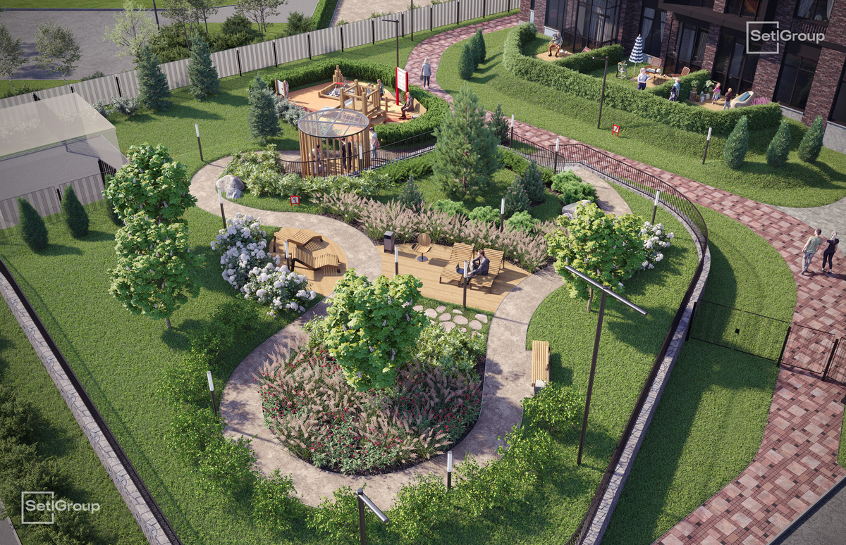 • Единая входная группа с авторским дизайном и лаундж-зоной