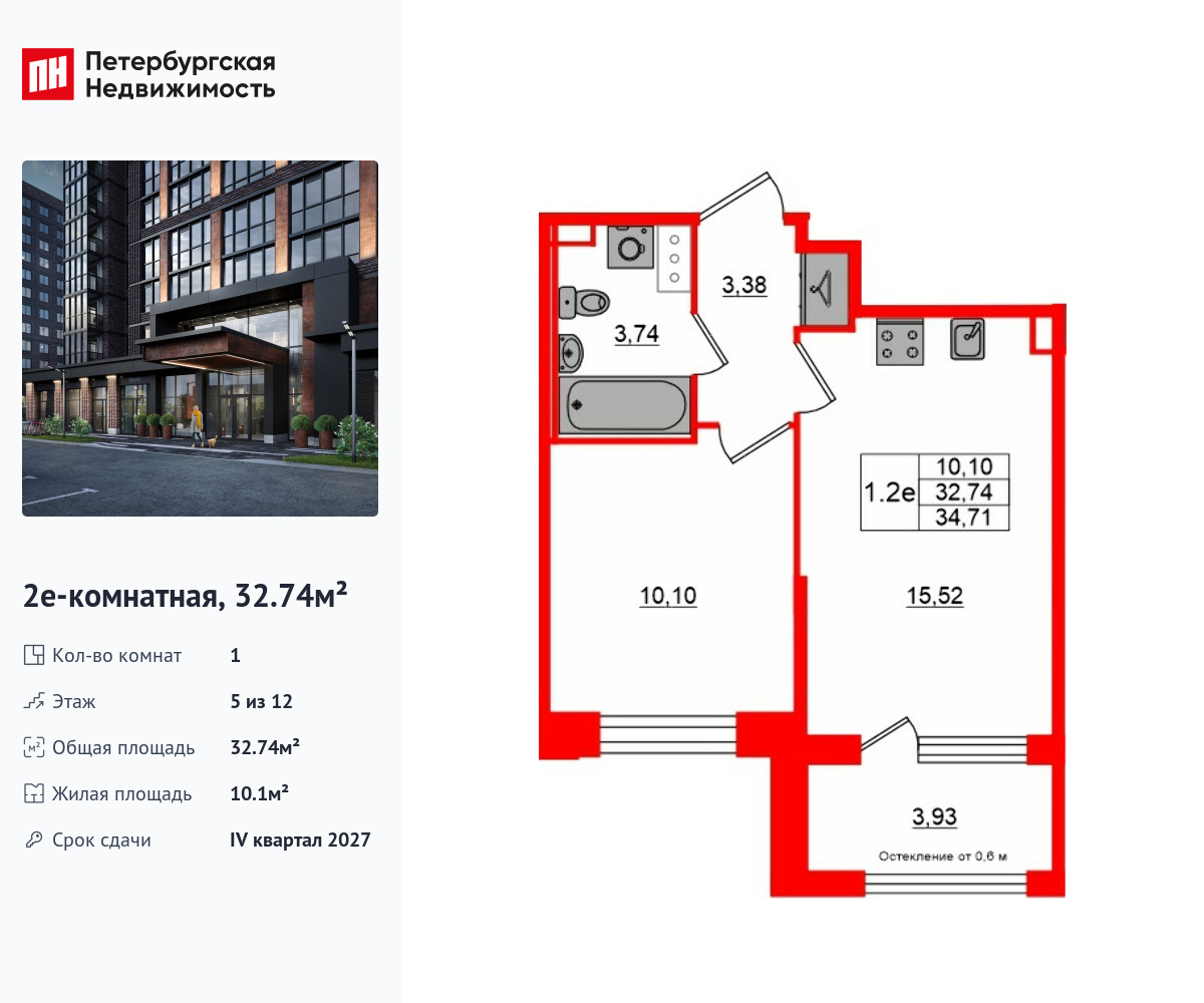 Удобная, классическая, функциональная европланировка, большая кухня-гостиная 15.52 м², вместительная прихожая 3.38 м². Общая площадь квартиры - 32.74 м², жилая – 10.1 м², высота потолка 2.75 м.
