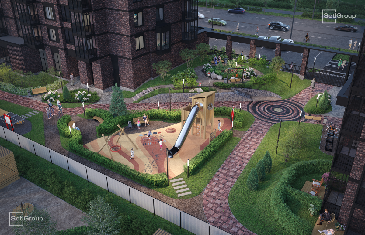 • Единая входная группа с авторским дизайном и лаундж-зоной