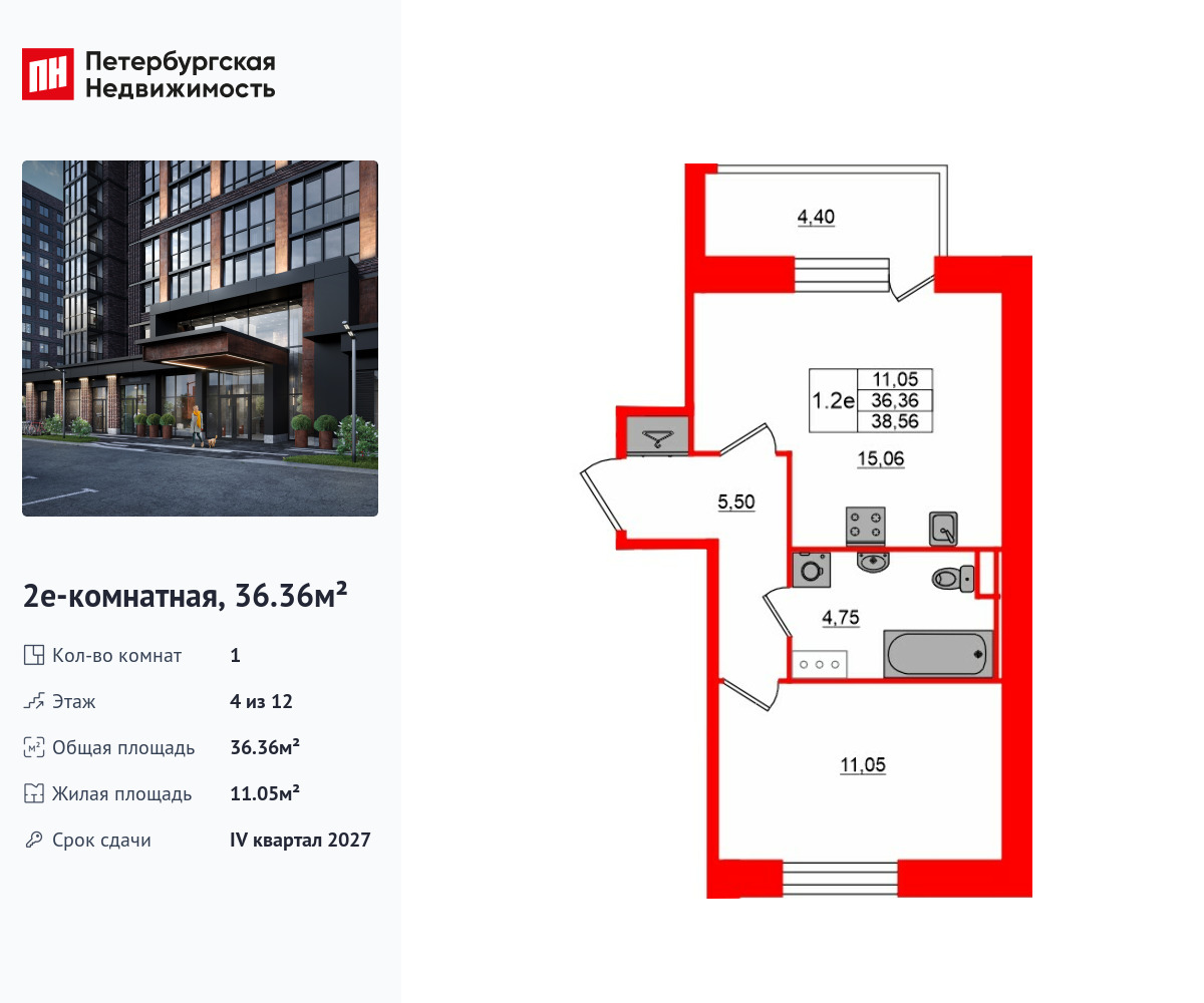 Удобная, классическая, функциональная европланировка, большая кухня-гостиная 15.06 м², просторная прихожая 5.5 м². Общая площадь квартиры - 36.36 м², жилая – 11.05 м², высота потолка 2.75 м.