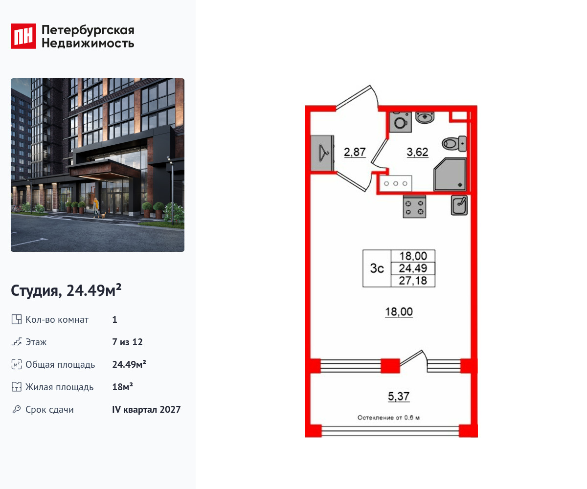 Удобная, классическая, функциональная европланировка, вместительная прихожая 2.87 м². Общая площадь студии - 24.49 м², жилая – 18 м², высота потолка 2.75 м.