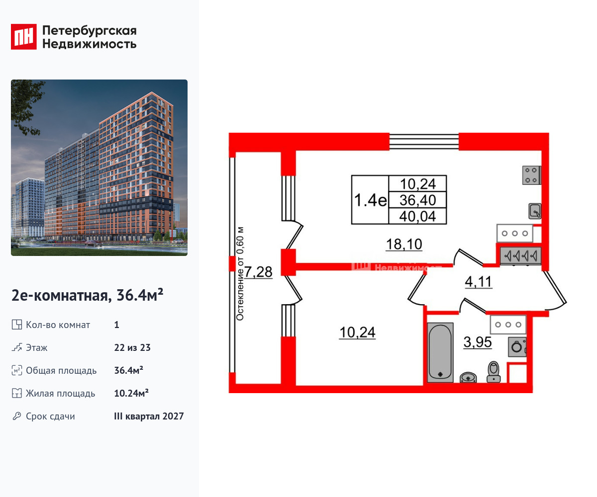 Удобная, классическая, функциональная европланировка, большая кухня-гостиная 18.1 м², просторная прихожая 4.11 м². Общая площадь квартиры - 36.4 м², жилая – 10.24 м², высота потолка 2.77 м.