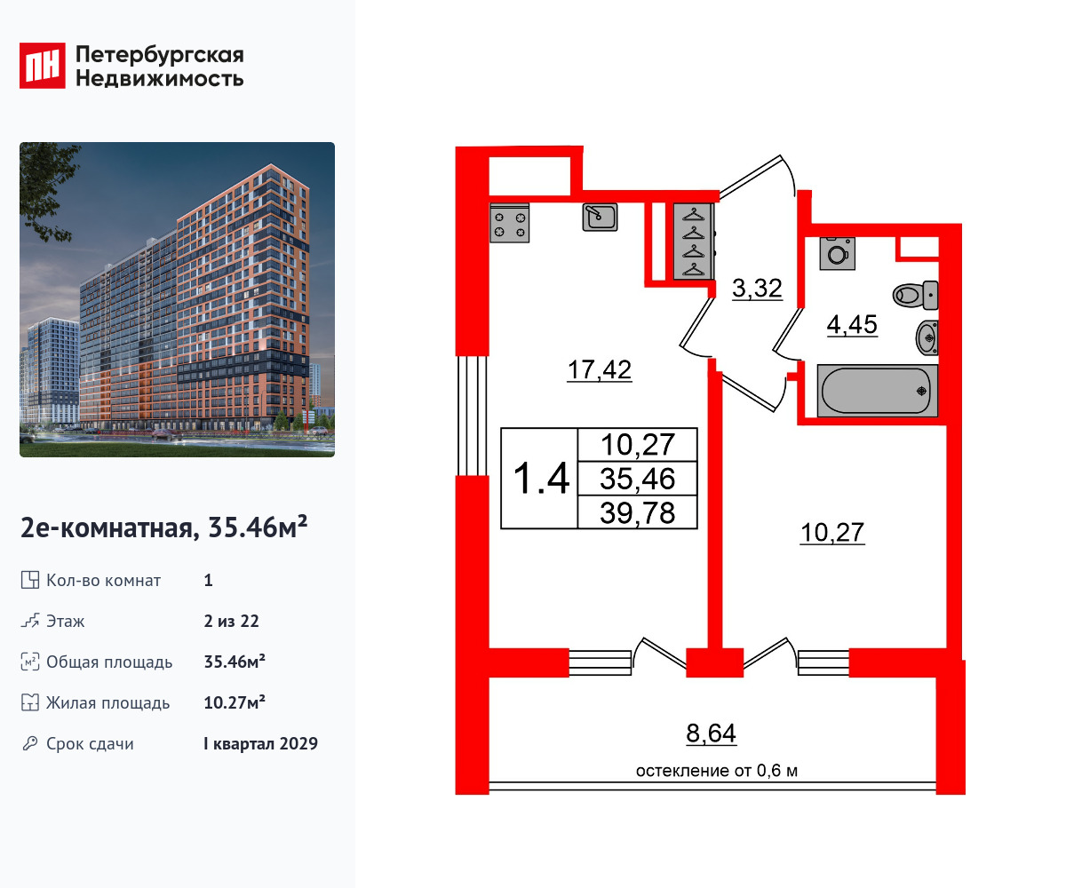 Удобная, классическая, функциональная европланировка, большая кухня-гостиная 17.42 м², вместительная прихожая 3.32 м². Общая площадь квартиры - 35.46 м², жилая – 10.27 м², высота потолка 2.77 м.