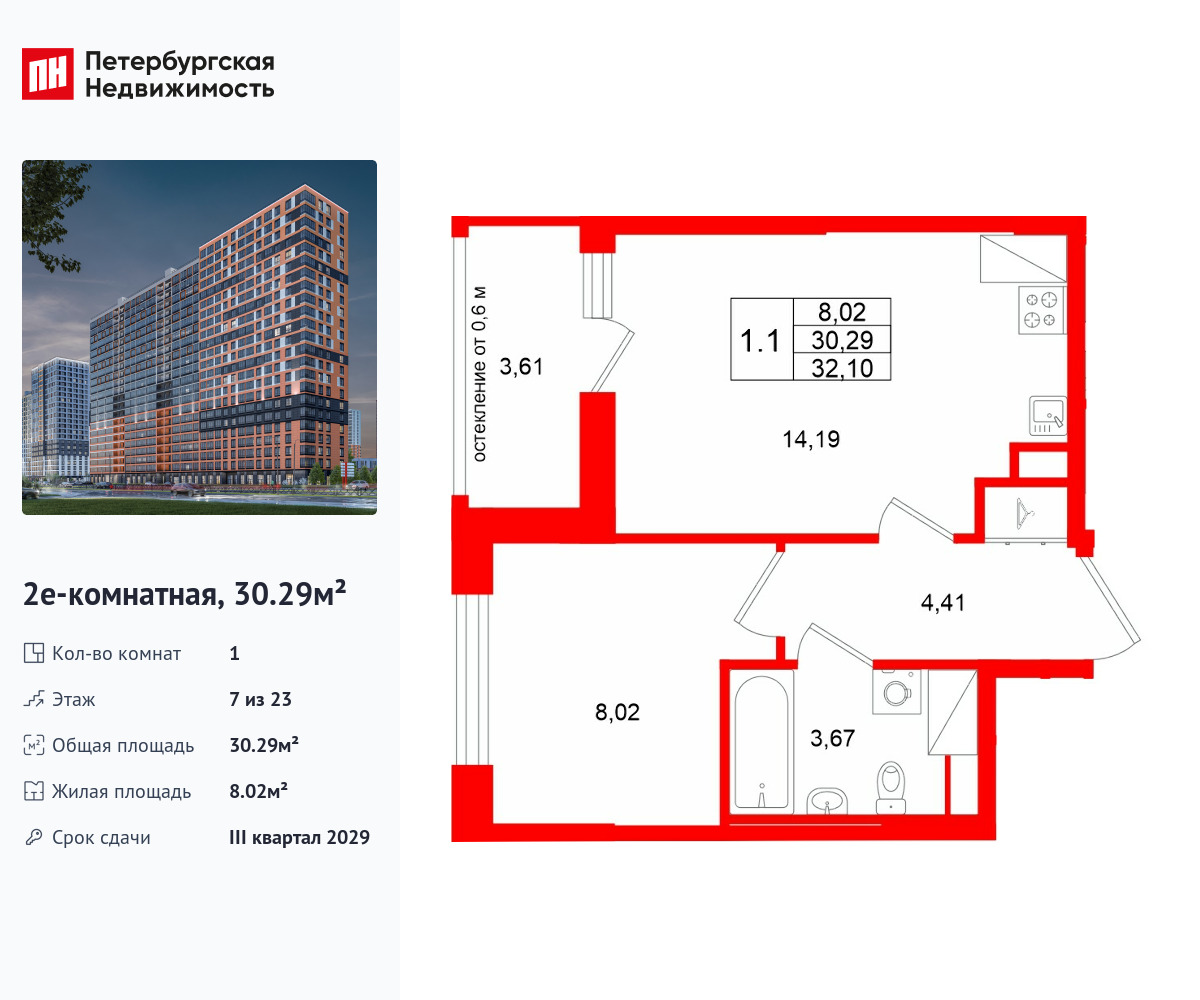 Удобная, классическая, функциональная европланировка, большая кухня-гостиная 14.19 м², просторная прихожая 4.41 м². Общая площадь квартиры - 30.29 м², жилая – 8.02 м², высота потолка 2.77 м.