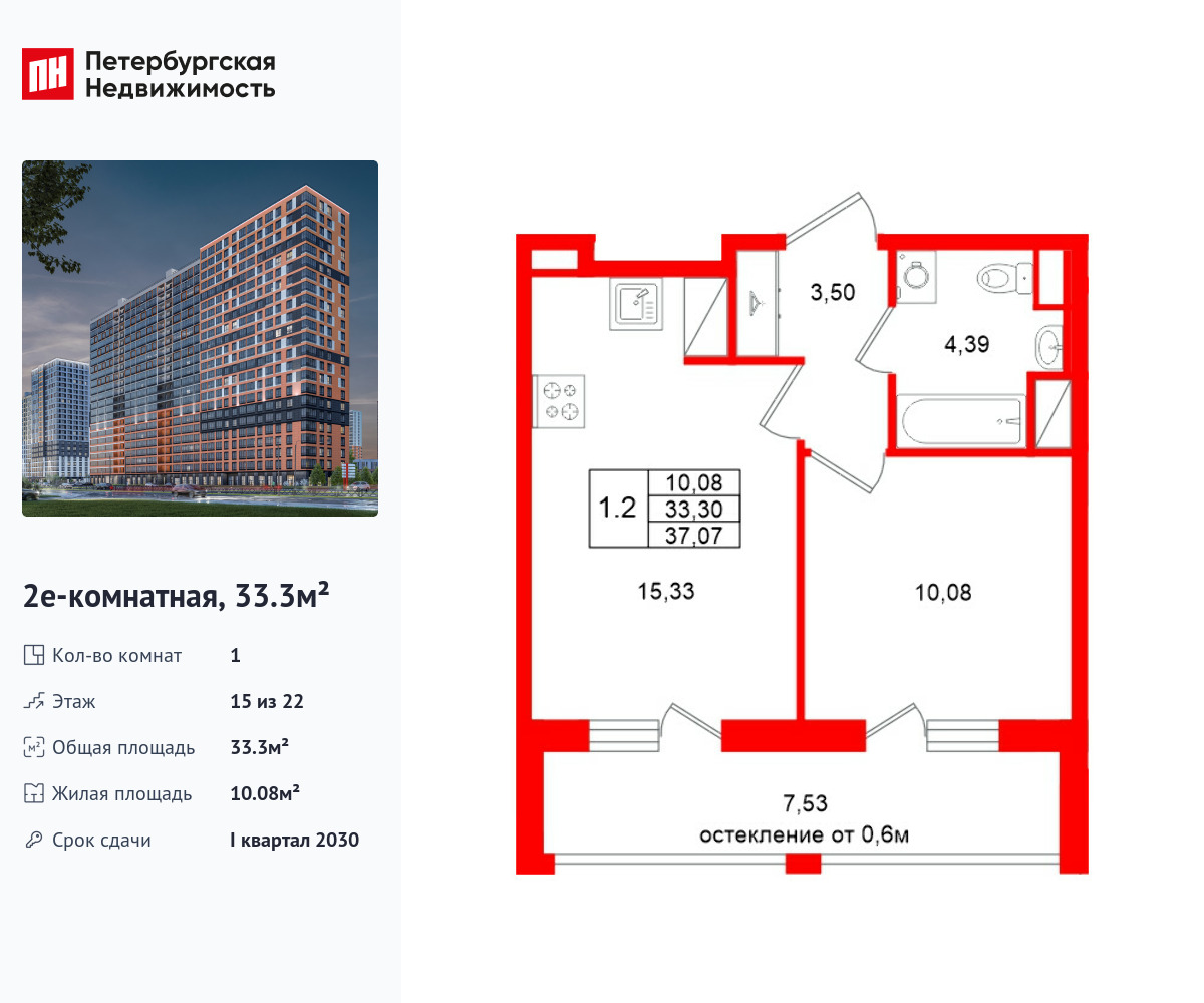 Удобная, классическая, функциональная европланировка, большая кухня-гостиная 15.33 м², вместительная прихожая 3.5 м². Общая площадь квартиры - 33.3 м², жилая – 10.08 м², высота потолка 2.77 м.
