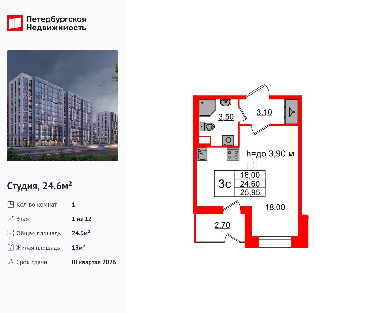 Удобная, классическая, функциональная европланировка, вместительная прихожая 3.1 м². Общая площадь студии - 24.6 м², жилая – 18 м², высота потолка 3.97 м.