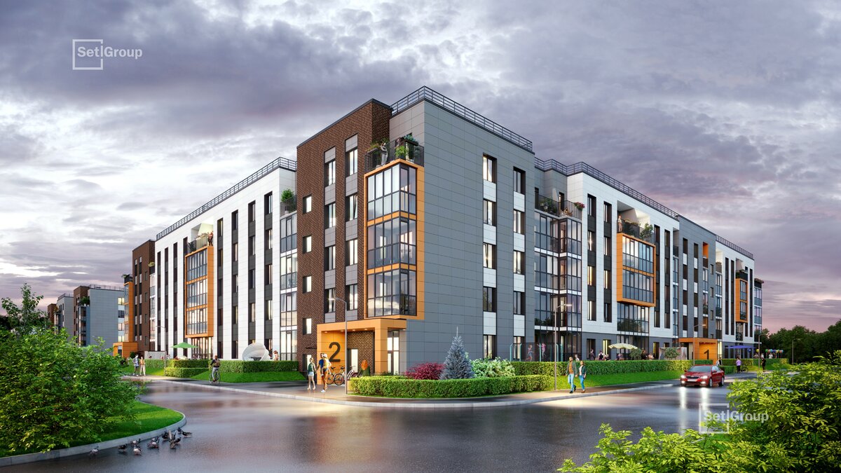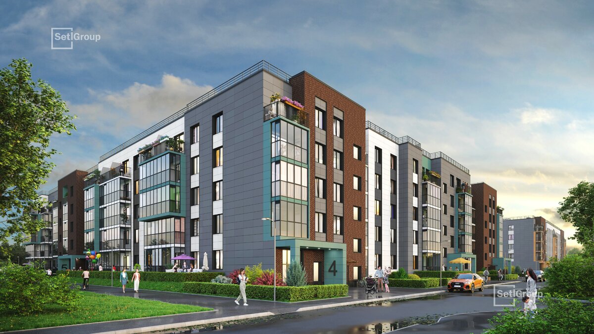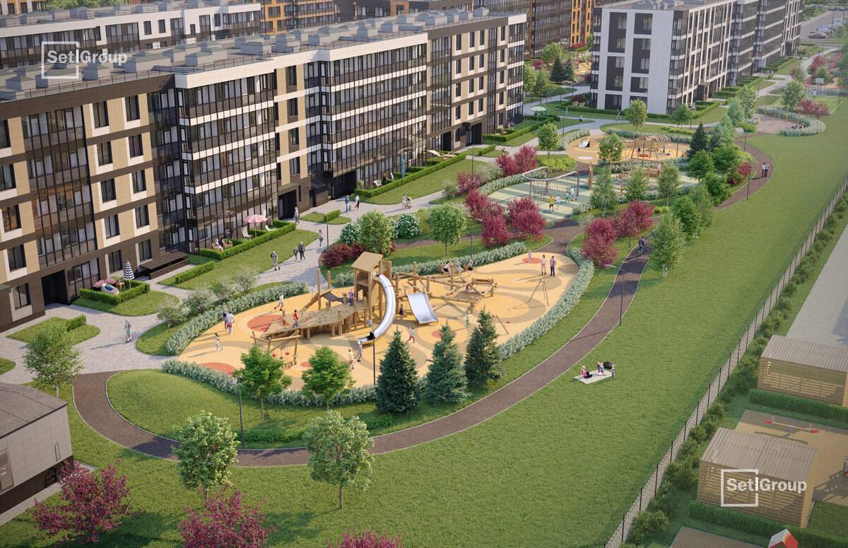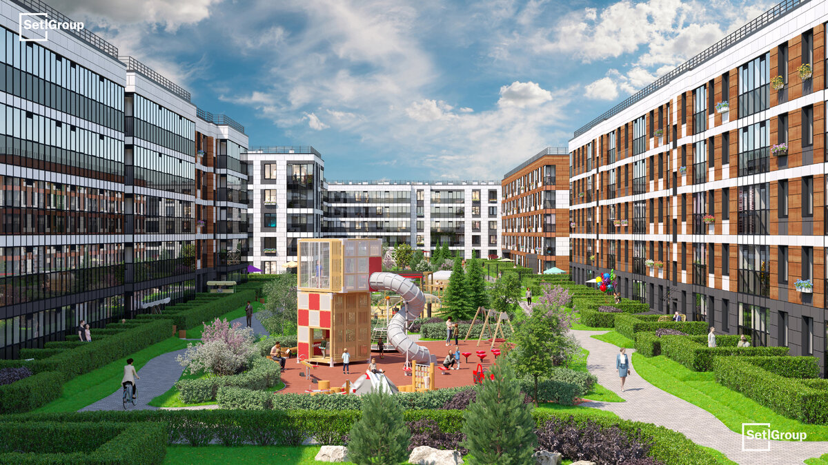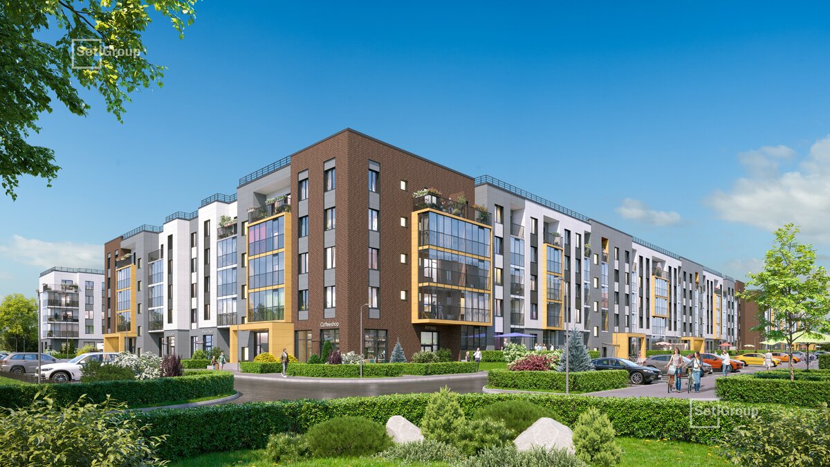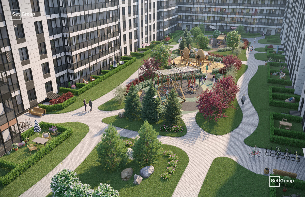 • Рекреационные зоны: парадный парк в центре квартала, ручей с собственной набережной, центральная площадь, ресторанный комплекс и пешеходный бульвар