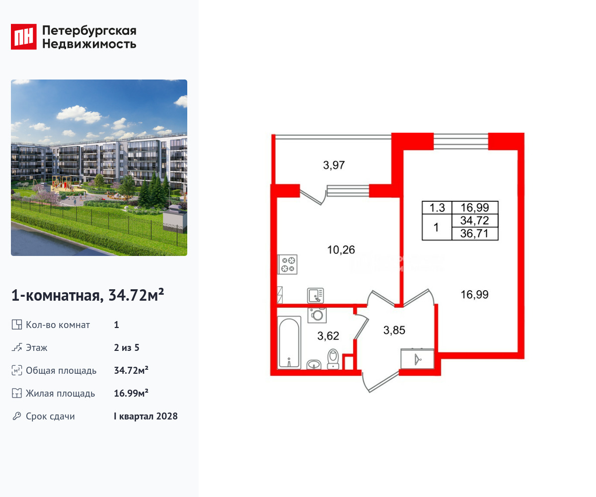 Удобная, классическая планировка, кухня 10.26 м², вместительная прихожая 3.85 м². Общая площадь квартиры - 34.72 м², жилая – 16.99 м², высота потолка 2.77 м.