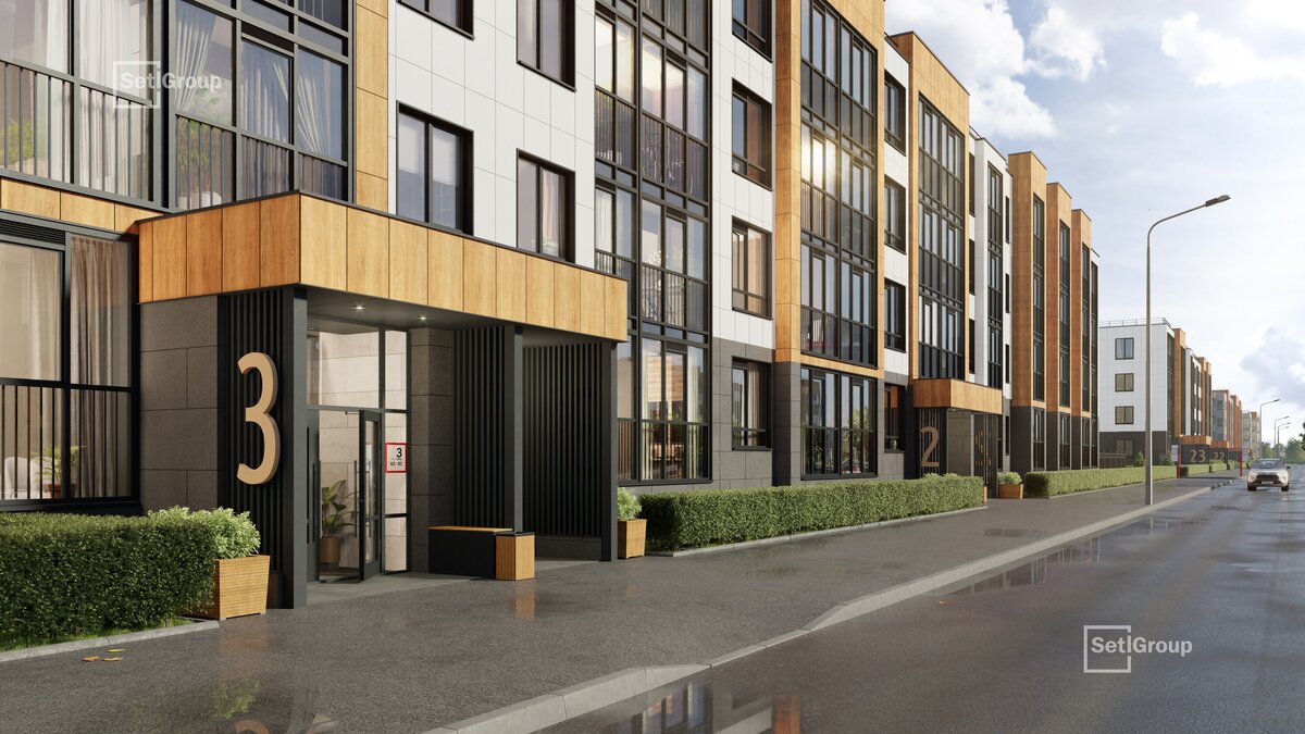 • Скандинавские фасады с отделкой керамогранитом, акцентные входные группы