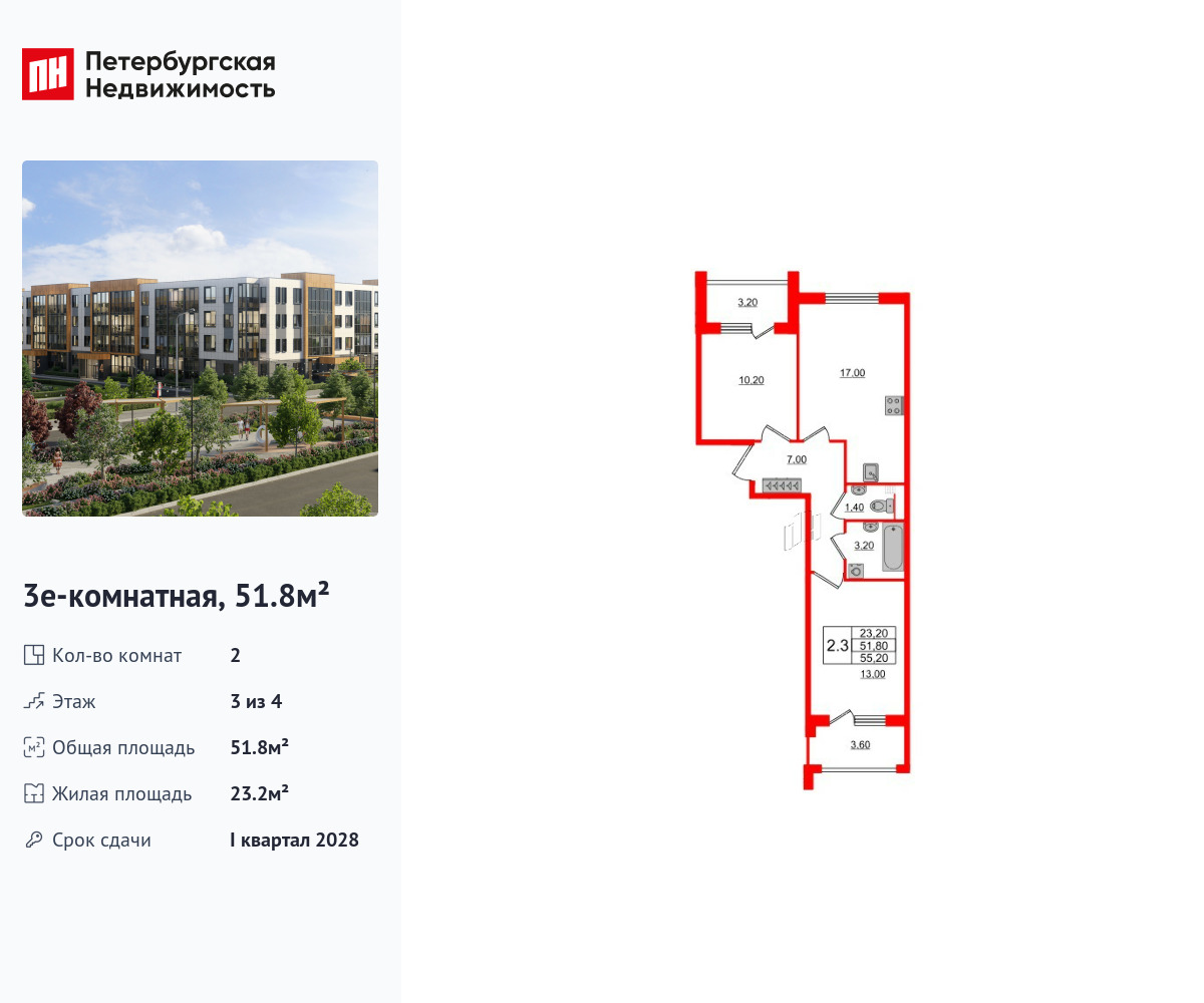 Удобная, классическая, функциональная европланировка, большая кухня-гостиная 17 м², вместительная прихожая 7 м². Общая площадь квартиры - 51.8 м², жилая – 23.2 м², высота потолка 2.78 м.