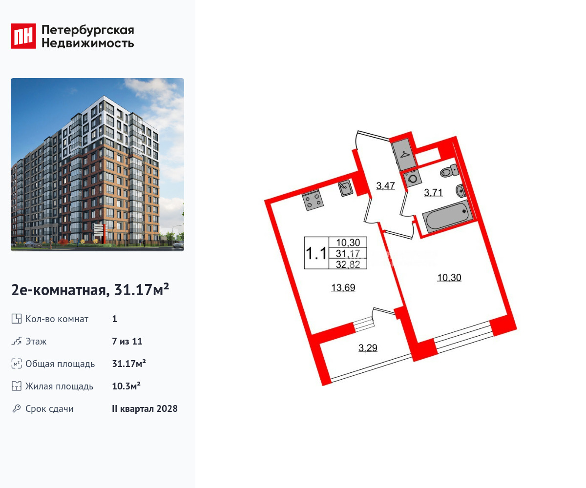 Удобная, классическая, функциональная европланировка, большая кухня-гостиная 13.69 м², вместительная прихожая 3.47 м². Общая площадь квартиры - 31.17 м², жилая – 10.3 м², высота потолка 2.77 м.