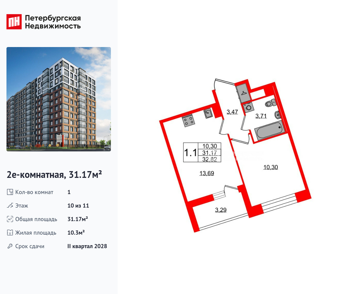 Удобная, классическая, функциональная европланировка, большая кухня-гостиная 13.69 м², вместительная прихожая 3.47 м². Общая площадь квартиры - 31.17 м², жилая – 10.3 м², высота потолка 2.77 м.