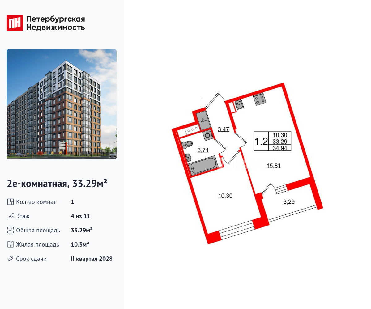 Удобная, классическая, функциональная европланировка, большая кухня-гостиная 15.81 м², вместительная прихожая 3.47 м². Общая площадь квартиры - 33.29 м², жилая – 10.3 м², высота потолка 2.77 м.
