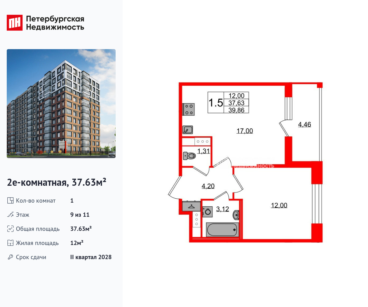 Удобная, классическая, функциональная европланировка, большая кухня-гостиная 17 м², просторная прихожая 4.2 м². Общая площадь квартиры - 37.63 м², жилая – 12 м², высота потолка 2.77 м.
