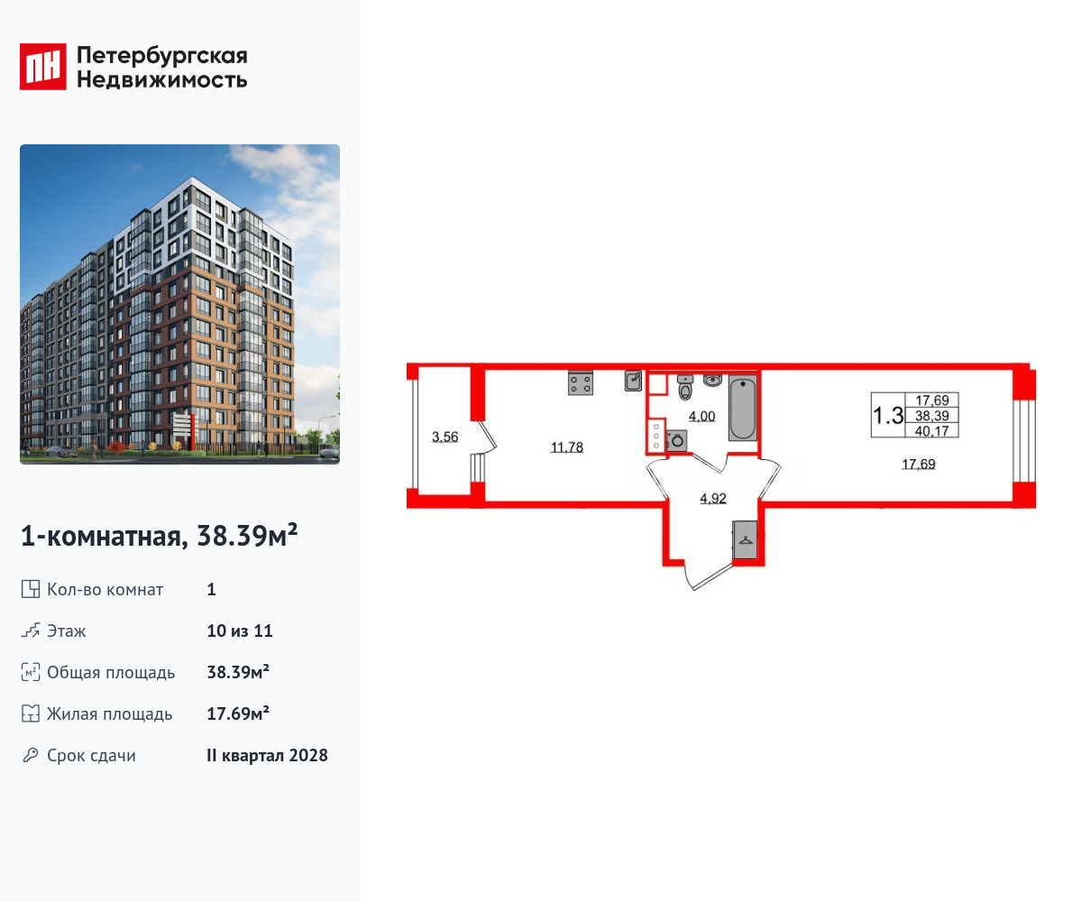 Удобная, классическая планировка, кухня 11.78 м², просторная прихожая 4.92 м². Общая площадь квартиры - 38.39 м², жилая – 17.69 м², высота потолка 2.77 м.