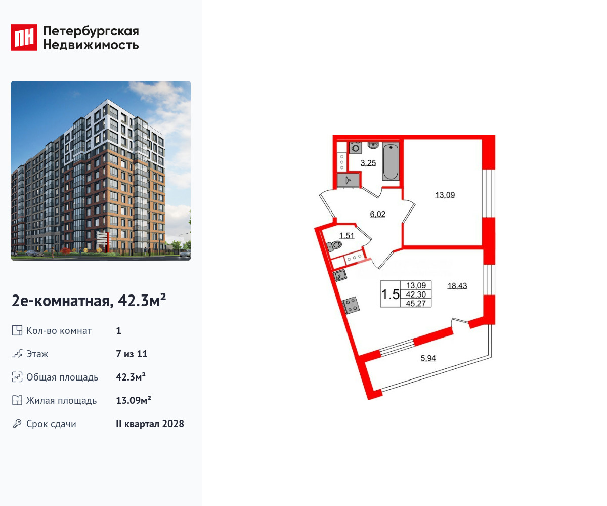 Удобная, классическая, функциональная европланировка, большая кухня-гостиная 18.43 м², просторная прихожая 6.02 м². Общая площадь квартиры - 42.3 м², жилая – 13.09 м², высота потолка 2.77 м.
