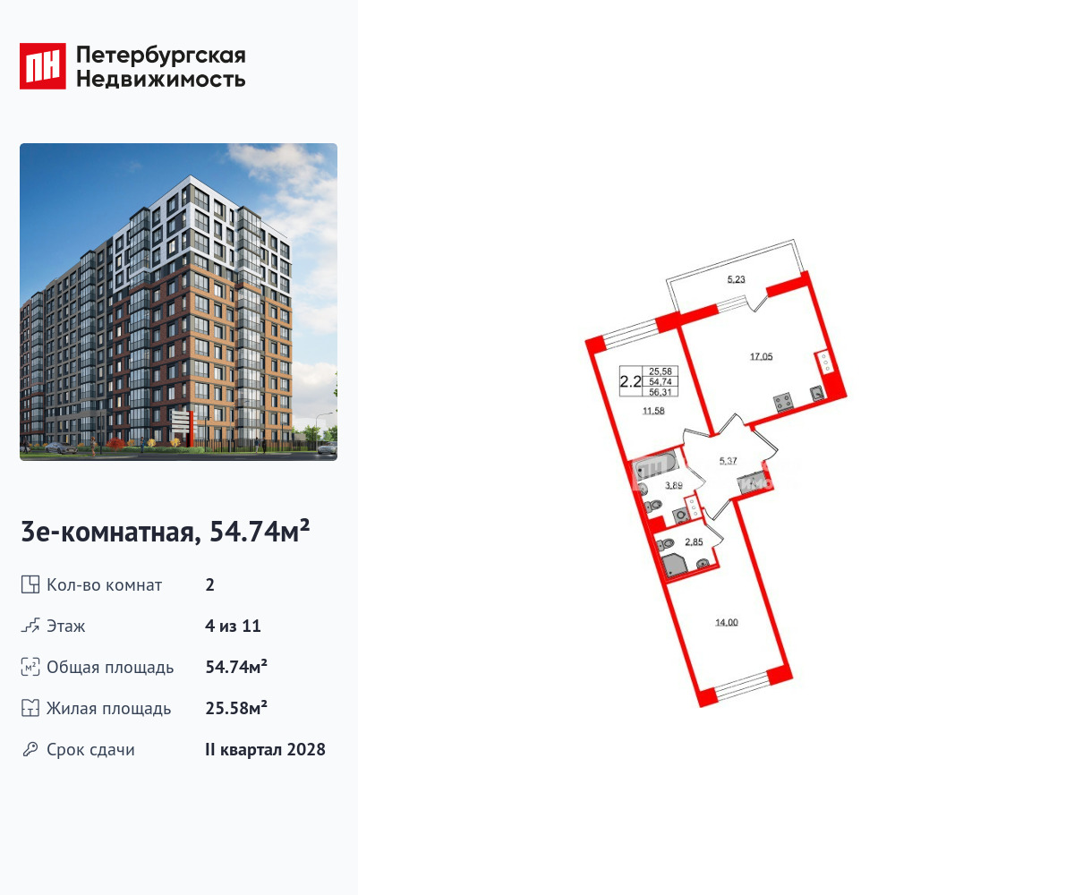 Удобная, классическая, функциональная европланировка, большая кухня-гостиная 17.05 м², вместительная прихожая 5.37 м². Общая площадь квартиры - 54.74 м², жилая – 25.58 м², высота потолка 2.77 м.