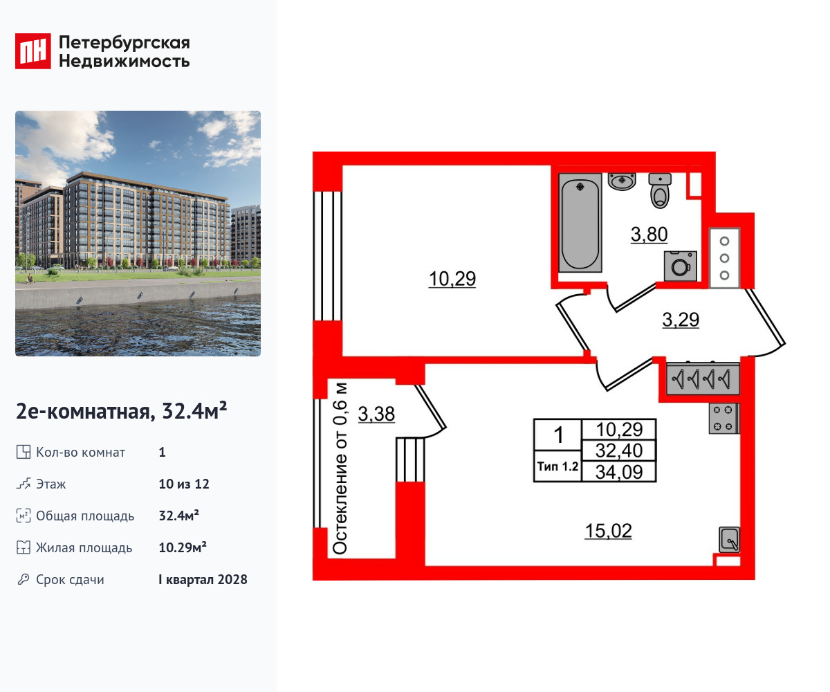 Удобная, классическая, функциональная европланировка, большая кухня-гостиная 15.02 м², вместительная прихожая 3.29 м². Общая площадь квартиры - 32.4 м², жилая – 10.29 м², высота потолка 2.77 м.