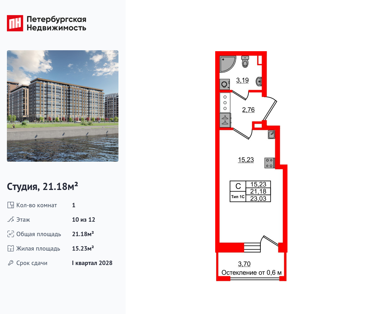 Удобная, классическая, функциональная европланировка, вместительная прихожая 2.76 м². Общая площадь студии - 21.18 м², жилая – 15.23 м², высота потолка 2.77 м.