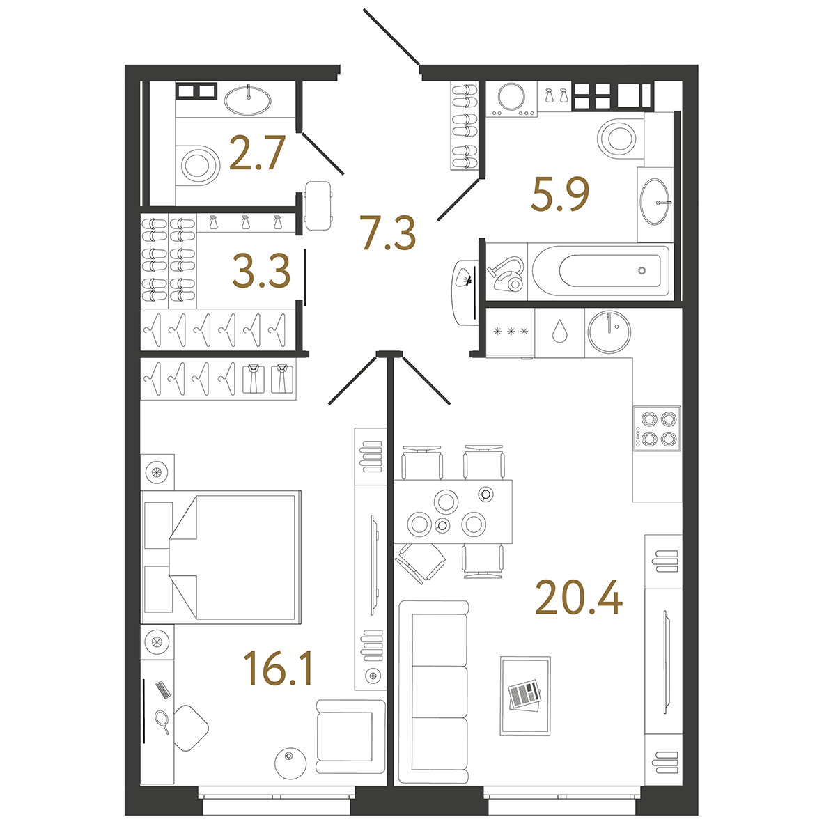 Площадь: 55.7 / 16.1 / 20.4