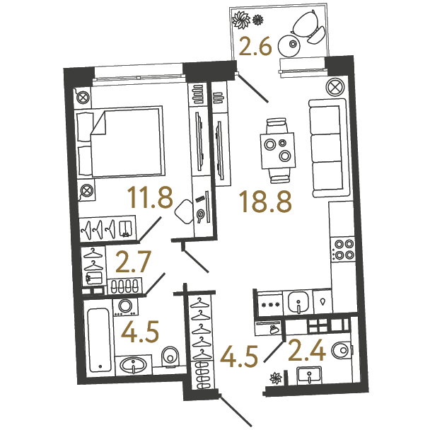 Площадь: 44.7 / 11.8 / 18.8